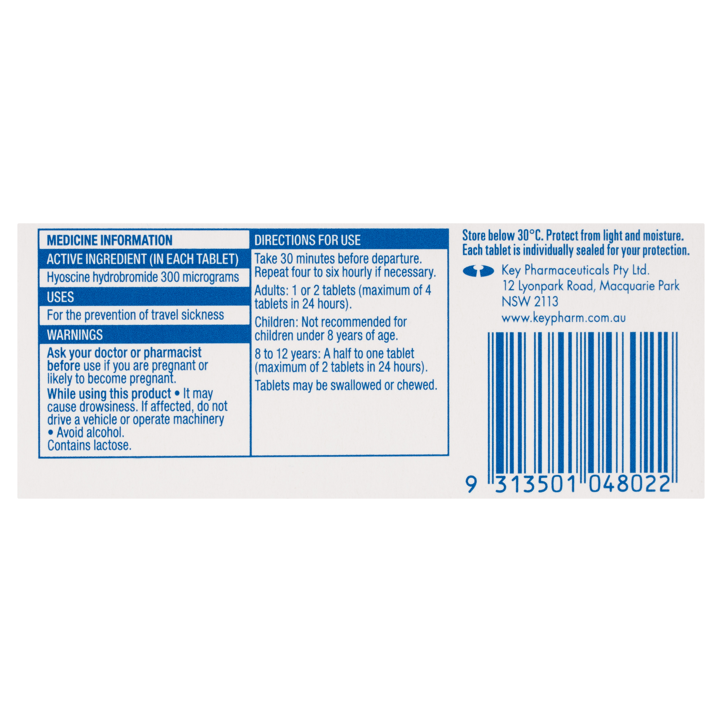 Active Ingredient per tablet: Hyoscine hydrobromide 300 micrograms